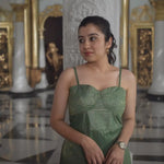Designed in a sleek midi sheath silhouette, the dress hugs your curves with refined structure, while the intricate silver pattern adds just the right amount of festive shimmer. Its fitted bodice, fine straps, and luxurious green tone make it ideal for brunches, parties, day events, anniversaries, or romantic dinner dates.